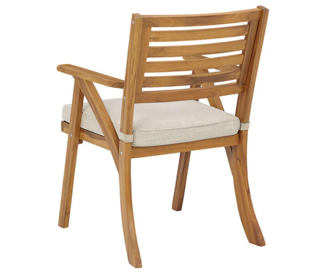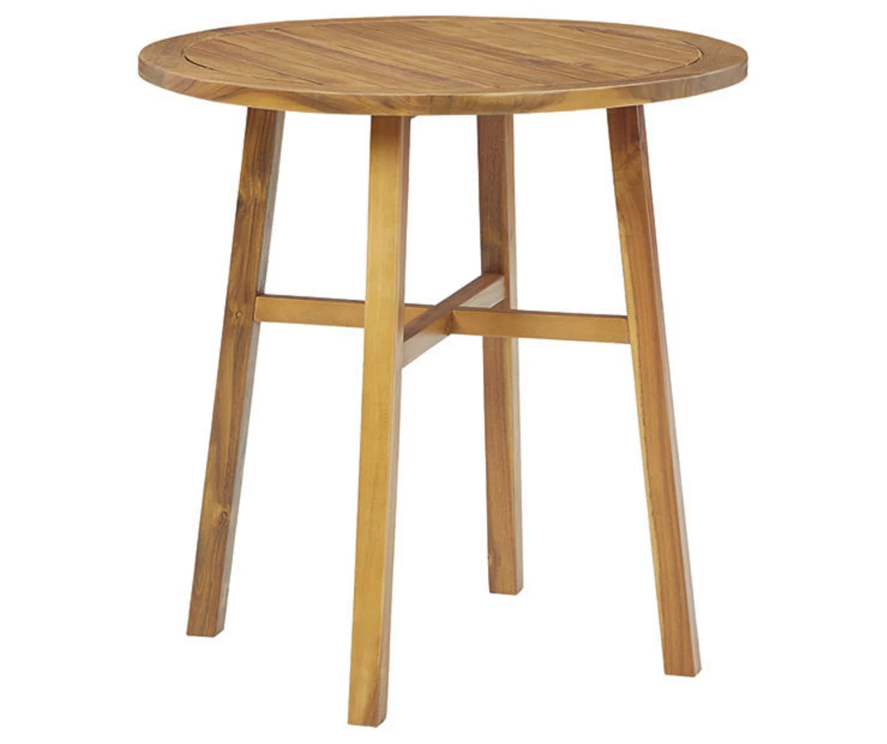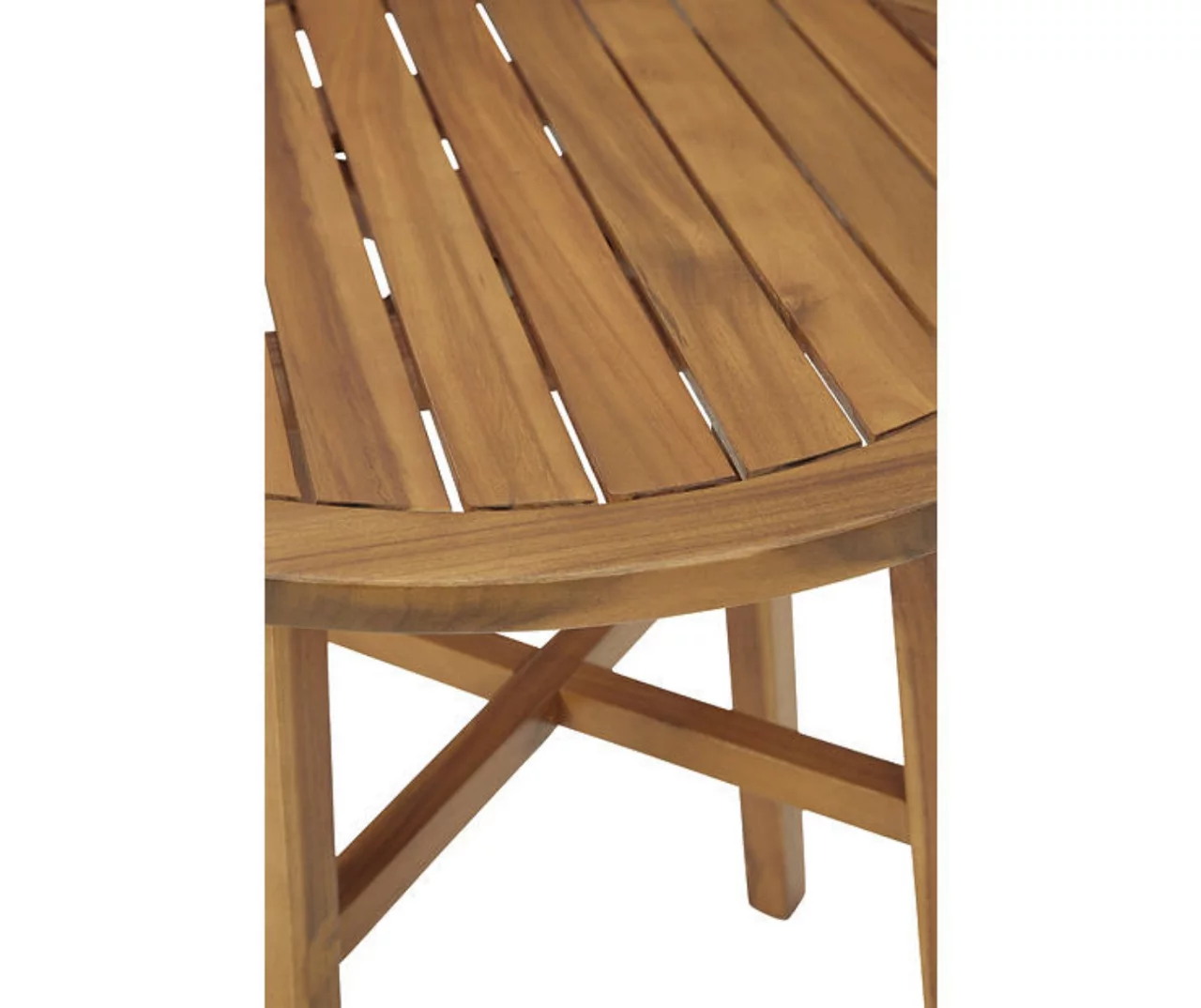 Turn an outdoor space into your own private oasis with this bistro set. The essence of easy-breezy outdoor living, this brilliantly styled bistro set is quality crafted of acacia wood in a natural teak tone for an exotic element. Delightfully low-maintenance seat cushions wrapped in Nuvella fabric perfect the aesthetic.