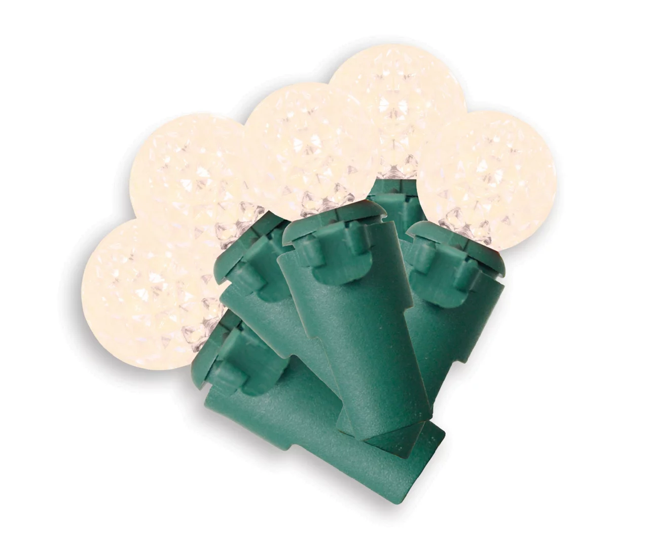 - Round diamond-cut sphere bulb covers in a warm white hue