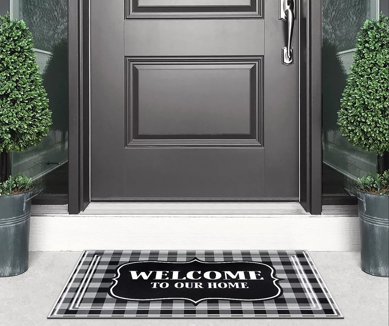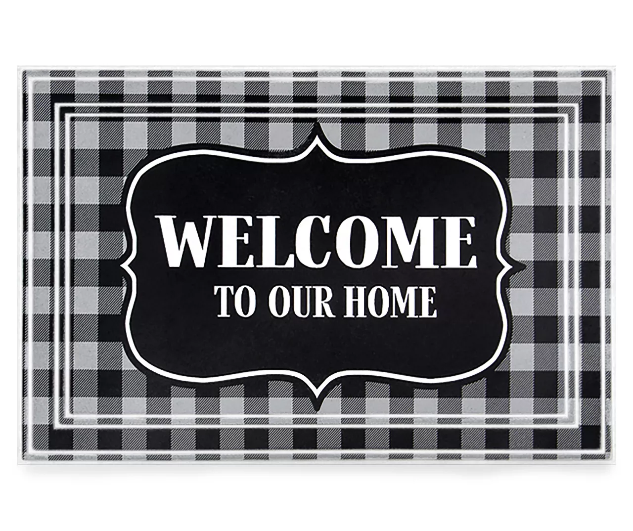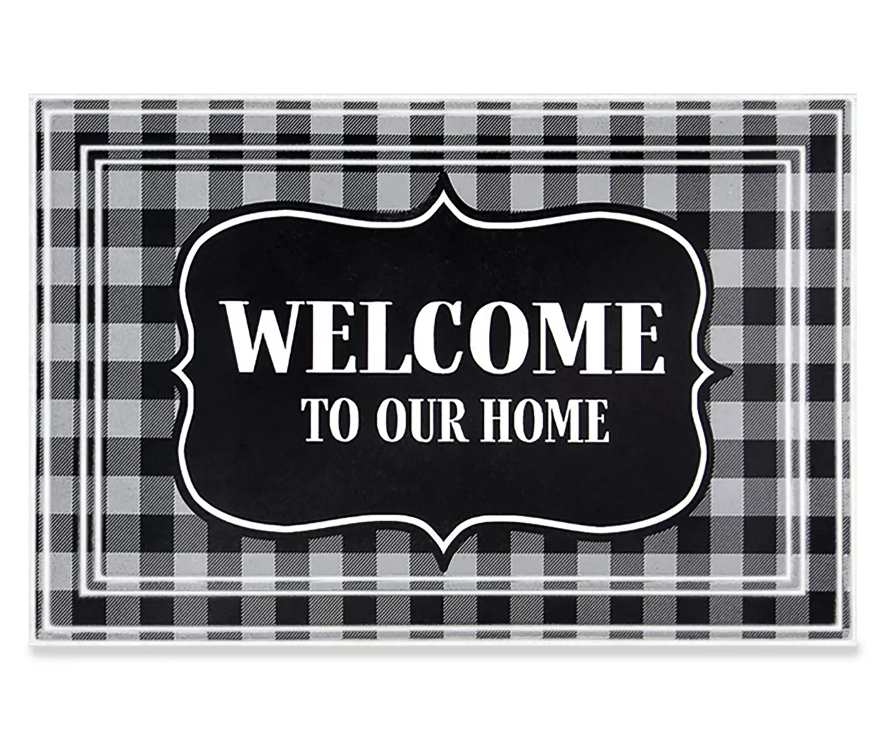 Greet guests in farmhouse fashion with this outdoor mat! A perfect addition at the front or back door, it showcases a black and white gingham print alongside a welcoming sentiment.