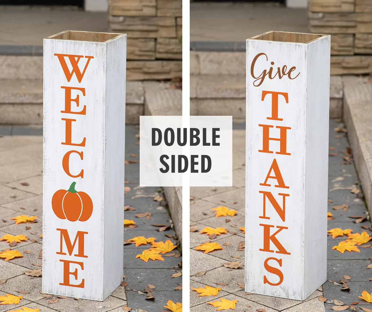 - Double sided message reads “welcome” and “give thanks” in orange and brown lettering