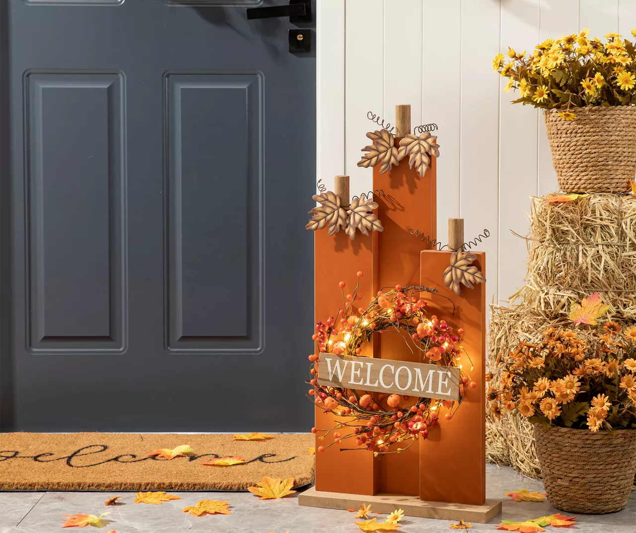 If you’re looking for a gorgeous addition to your porch or entrance, look no further than this lovely wooden pumpkin display. The light-up wreath, festive orange pumpkins and sweet “welcome” message creates a fun, lighthearted atmosphere in any space. Perfect for decorating an entryway or living space.