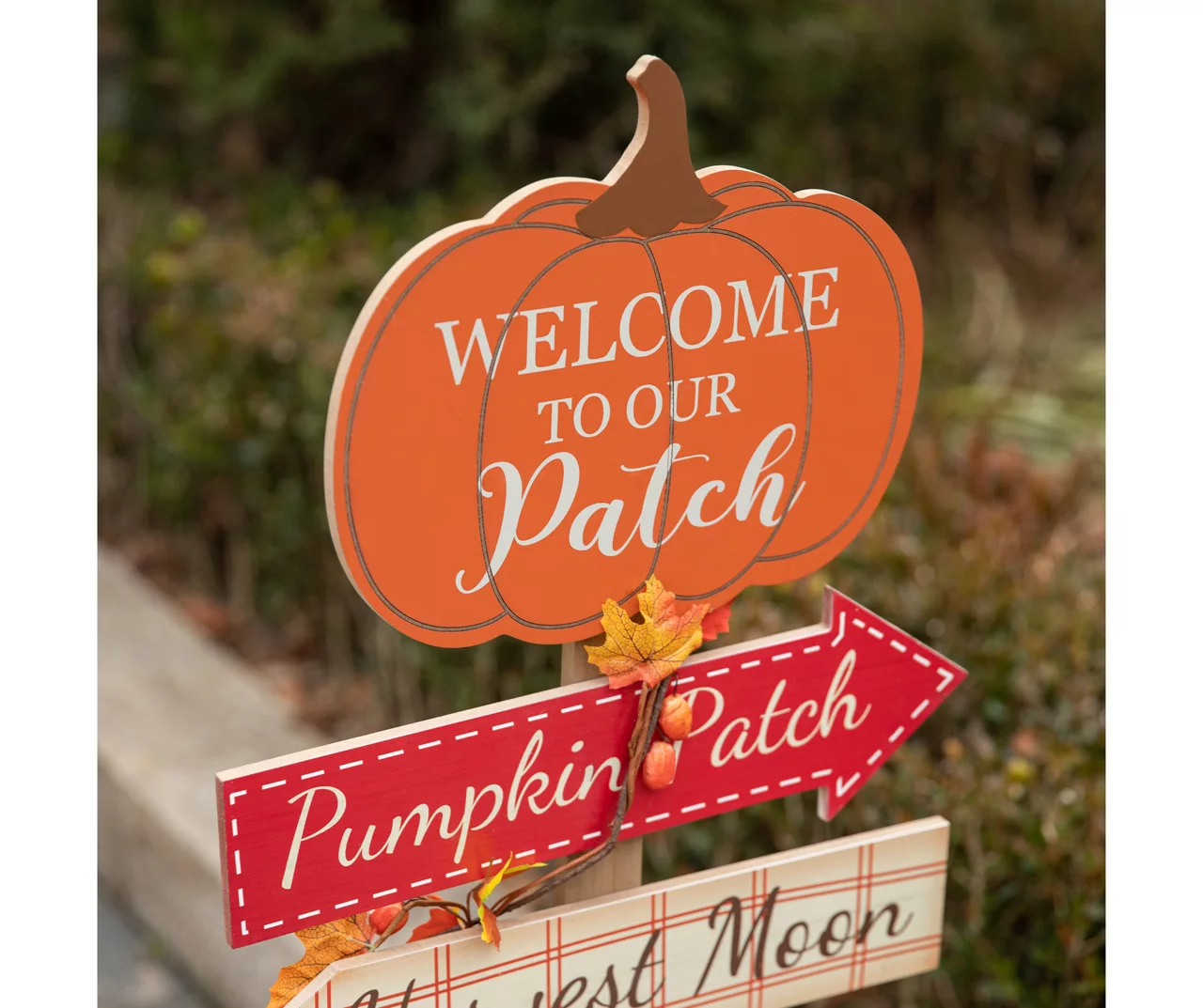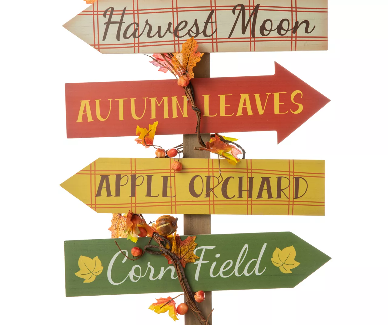 - Sign messages include “pumpkin patch”, “harvest moon”, “autumn leaves”, “apple orchard” and “corn field