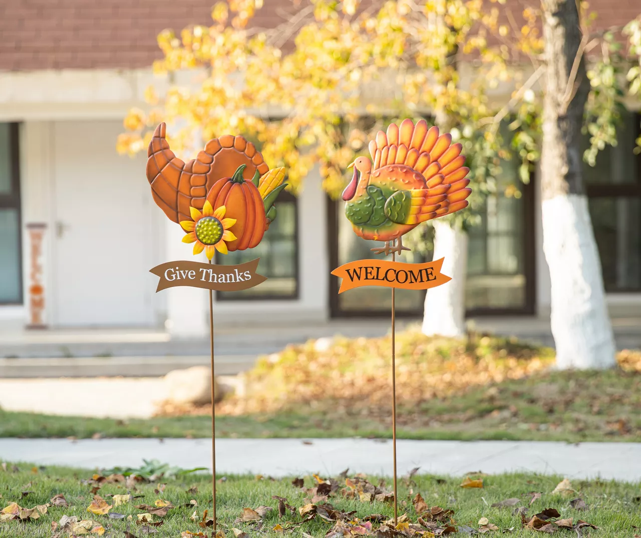 Decorate your home’s exterior for the season of gratefulness using this metal yard stake set! Each piece features a waving banner with a message as an icon for the holiday displays above in either a cornucopia or turkey. This set is a charming addition to a lawn or garden.